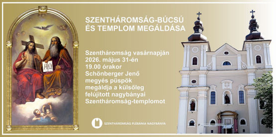 A több mint három évszázados múltra tekintő nagybányai Szentháromság-templomunk új és szebb arculatot nyert az elmúlt öt évben végzett átfogó külső felújítási munkálatoknak köszönhetően. Szentháromság vasárnapján, templomunk búcsúünnepén,2026 május 31-én, a 19 órakor Schönberger Jenő megyés püspök által bemutatott szentmisében adunk hálát a Jóistennek, és mondunk köszönetet mindazoknak, akik imával, munkával és adományaikkal járultak hozzá templomunk külső megújulásához.