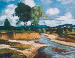 (...) pályáját a festõtelep közelsége determinálta. Sorsszerû a találkozás. Ha gyermekkora játszótereinek közelében nincs a Jókai-dombi festõszÃn, ahol naponta titokzatos varázslatok történnek, úgy bizonyára megmarad apja mesterségénél. (...) Elõször talán Grünwald Béla figyelt föl tehetségére, s vitte magával a Hollósy-növendékek közé. Hollósy már ingyen tanÃtotta, s annyira értékelte kivételes tehetségét, hogy képeit a tanÃtványok kiállÃtásán a legjobb helyre akasztotta. Növendéke lett azután az 1902-ben alakult szabadiskolának is, s az alapÃtó mesterek mindenike tanÃtotta. (...) Nagybányai tájak, köztük utcaképek, s a környék, mindenekelõtt az Izvora és a Rozsály hegyvidéki részletei tárulnak föl festményein. Kobaltkék egek feszülnek tájaira, melyeket nem egyszer fölfokozott szÃnviláguk tesz festõileg érdekesebbé. Képkivágása kiegyensúlyozottnak, motÃvumai szellemesen megválasztottak. Tájképein nem jelenik meg az ember, de â mint a barbizoniaknál -, hangsúlyok nélkül is érzõdik jelenléte. Fönnmaradt két kompozÃcióvázlata is (Csatakép 1848-ból, Követválasztás Nagybányán), tanúságaként annak, hogy nagyobb feladatokra is képes lett volna. Mint festõtárs és jóbarát közkedvelt volt a telepen. Baráti kapcsolatok fûzték a késõbbi neósok közül Czóbel Bélához és Perlrott Csaba Vilmoshoz. Czóbel expresszÃv erejû, nagyszerû portrét festett róla, s ajándékozta a beteg fiúnak. Ez a kép, a rokonainál õrzött, szeretettel egyben tartott hagyaték más mûveivel együtt a nagybányai múzeumba került. |