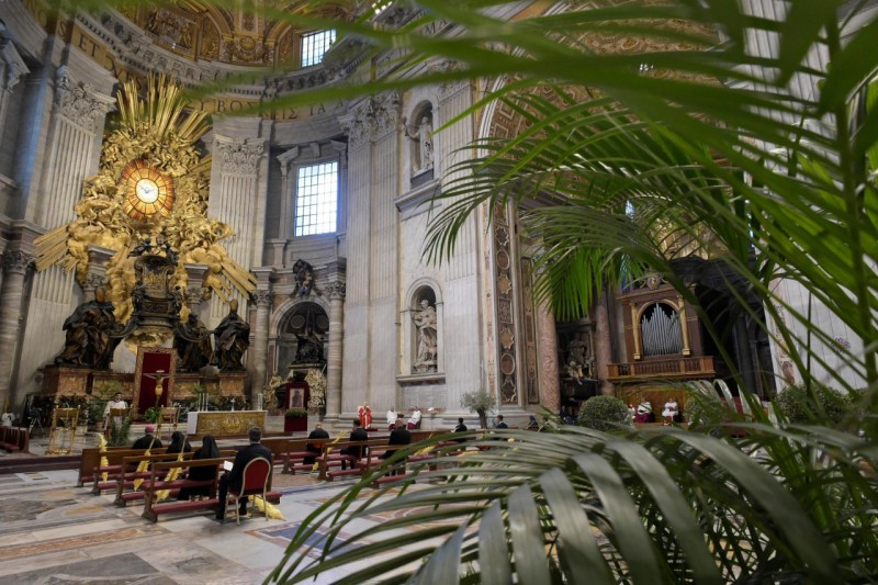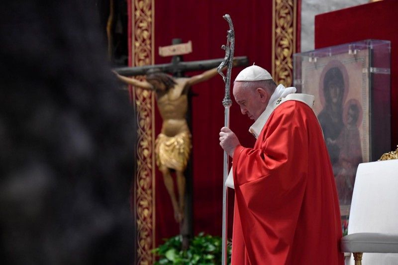 Április 5-én a Szentatya a Szent Péter-bazilikában csak néhány hívővel és a liturgikus szolgálattevőkkel mutatta be a világvasárnapi szentmisét. Erre a napra esik a 35. ifjúsági világnap is. Beszédében a szolgálat központi jelentőségéről, Istennek az elárultatást és elhagyatottságot is vállaló szeretetéről elmélkedett.